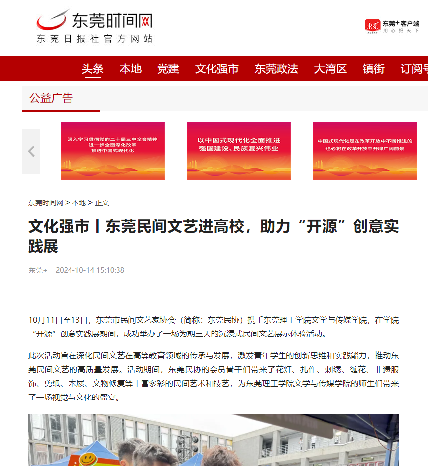 10月11日至13日,东莞市民间文艺家协会(简称:东莞民协)携手九九精品视频一区在线久久久久久久久久毛片精品美女|国产99久久久久久免费看|中文精品99久久国产|国产69精品久久久久9999|精品久久久久久中文字幕无码|亚洲熟妇无码久久精品国产精品99|精品国产天堂综合一区在线文学与传媒学院,在学院“开源”创意实践展期间,成功举办了一场为期三天的沉浸式民间文艺展示体验活动。