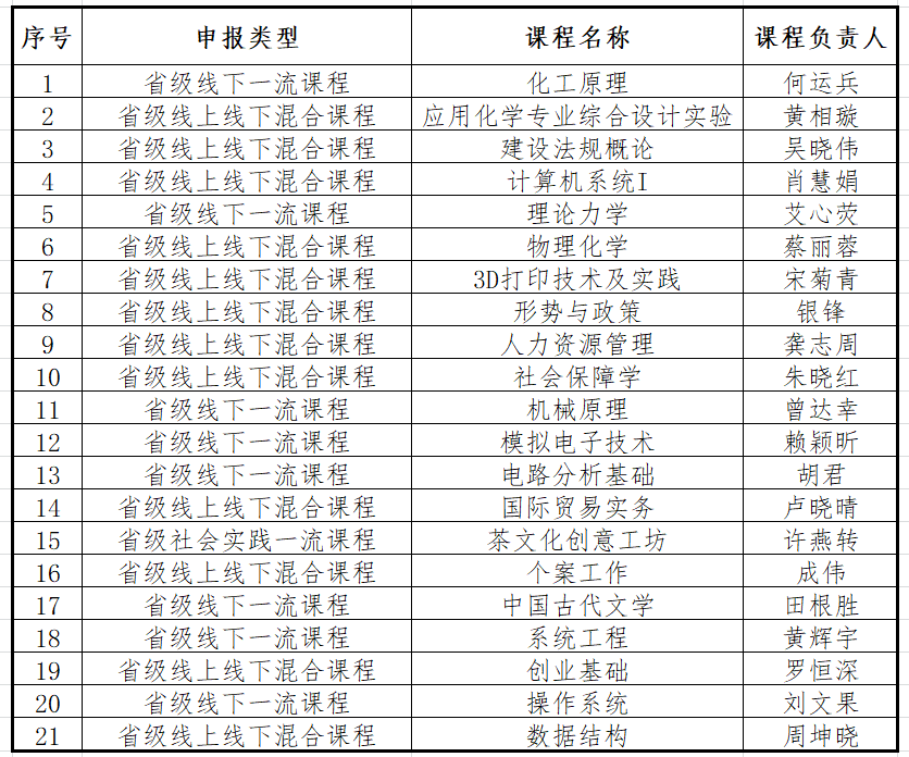 根据《广东省教育厅关于开展2021年度省一流本科课遴选认定工作的通知》要求,教务处组织校外专家对申报的45门课程进行评审。根据评审结果,拟推荐《化工原理》等21门课程申报2021年广东省一流本科课程。现将名单公示如下: