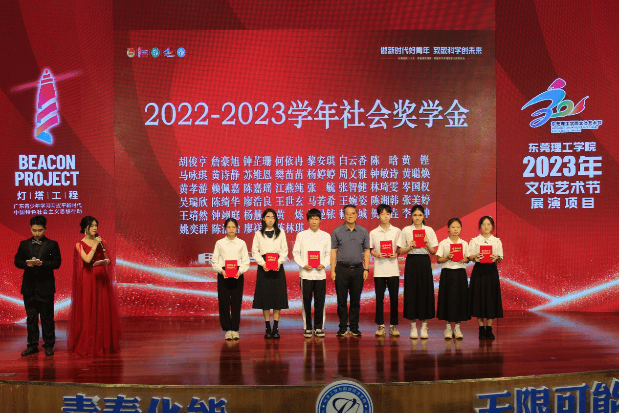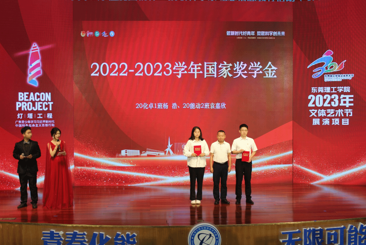 在颁奖仪式环节,分批表彰了获得2022-2023学年国家奖学金、社会奖学金、校内一等奖学金的学生,化能学院党委书记尹辉斌,副院长黄斯珉、张刚、何运兵,党委副书记杨方以及受邀到场的企业嘉宾东莞市能源投资集团有限公司能源研究院常务副院长、东莞新锋光伏能源科技有限公司总经理李三军,东莞海丽控股集团有限公司总经理赵海红分别为获奖学生颁奖。荣获社会助学金和校内一等奖学金的2022级化卓1班廖祥如同学表示,非常感谢学校和老师的培养,将继续努力、接续奋斗,与时代同行,争做有为青年,成为更优秀的自己。2023级能动1班黄政豪同学看到台上受到表彰奖励的学长学姐们,表示要向榜样学习,做新时代好青年,致敬科学创未来。